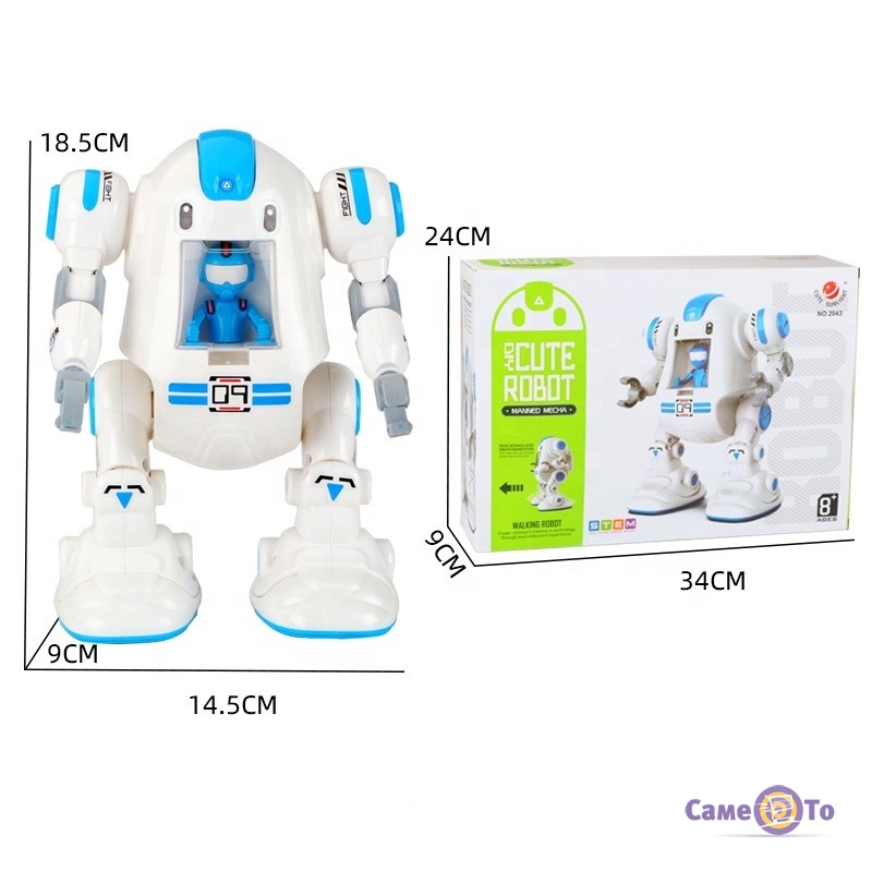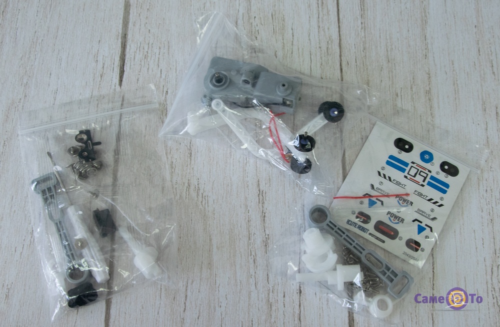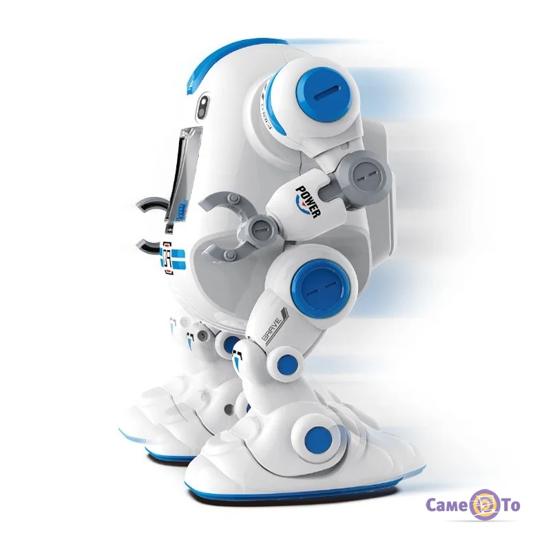Колір робота - білий, розмір в зібраному вигляді становить 13,5 на 19 на 9 сантиметрів. Виготовлена модель в Китаї. Виробник рекомендує купувати цю іграшку тільки для дітей старше восьми років. Для роботи потрібно дві батарейки формату АА (пальчикові), їх потрібно купити окремо. Щоб зібрати цей конструктор з робототехніки, вам знадобляться ножиці, кусачки і додаткова викрутка - вона йде в комплекті, але для збірки її недостатньо. У комплектацію набору з роботом входить: інструкція, пластикові деталі, коробка передач, шатуни і важелі, гвинти, наклейки і картонна упаковка.