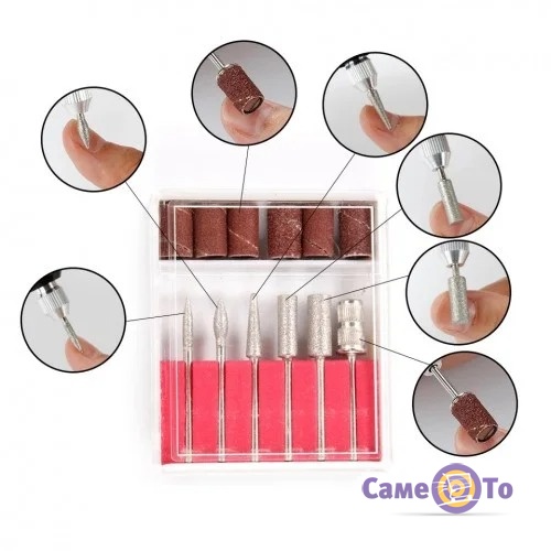 Ручка має 6 насадок, які підходять для обробки краю нігтя, шліфування, тонкого шліфування, видалення кутикули, видалення мозолі і грубої шкіри, чищення під нігтями, фінішна шліфовка. Для коригування нарощених нігтів, в комплекті є насадки з різною жорсткістю. Їх можна використовувати для різного ступеня шліфування і різної швидкості. Також її можна використовувати для інших дрібних деталей, які потрібно відшліфувати.