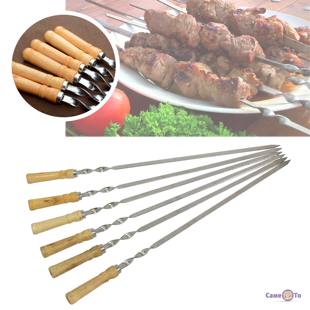 Шампури для шашлику з дерев'яною ручкою (54 см), нержавіюча сталь, набір з 6 штук