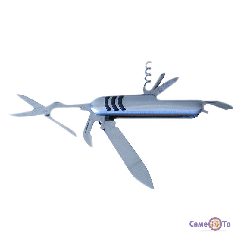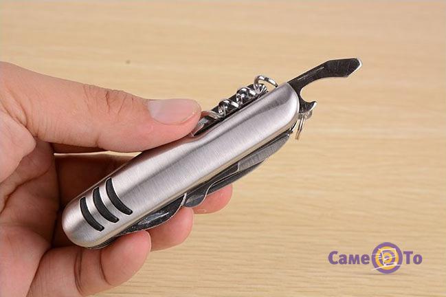 Сьогодні ми радимо Вам звернути увагу на ніж мультитул 7 в 1. Він має класичний дизайн, невеликі параметри, тому його можна завжди возити з собою в авто або носити в похідному рюкзаку. Даний ніж об'єднав в собі різні можливості, і тепер з Вами завжди будуть і штопор, і відкривачка для консерви, і ножиці, і викрутка, і навіть пилка для нігтів. Всі ці прилади компактно складаються в один виріб у вигляді брелка і в складеному вигляді є цілком безпечними. Брелок можна не тільки носити в сумці, а й прикріпити за допомогою кільця-фіксатора до ременя або кишені. Аксесуар виготовлений з нержавіючої сталі, йому не страшна вода. Все це свідчить про довговічність ножа і про те, що він допоможе викрутитися з різних складних ситуацій навіть у повсякденному житті. Він допоможе відкрити посилку, прикрутити гвинтик, розрізати папір або поділити бутерброд. Вага складного ножа мультитула 7 в 1 становить всього 70 грам.