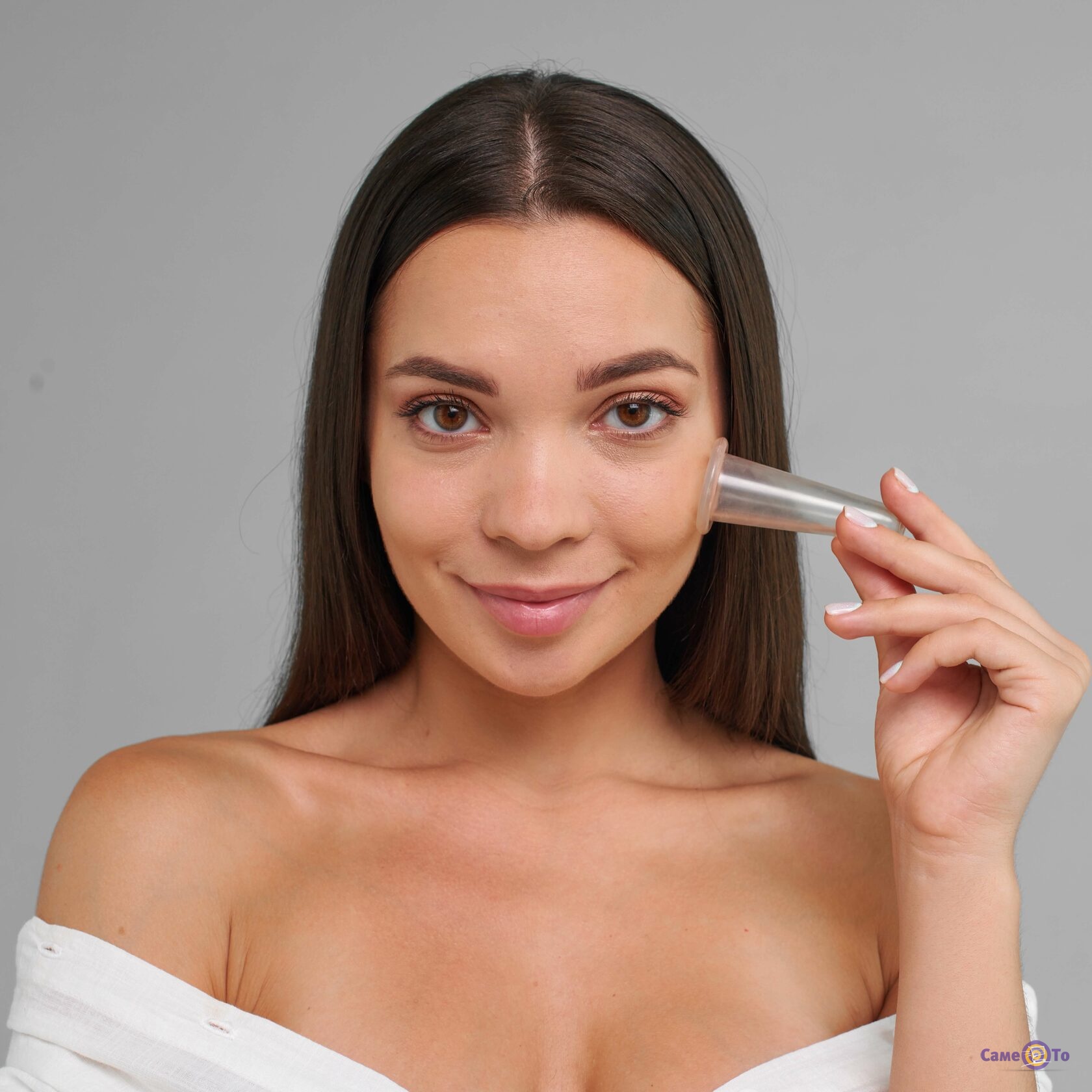 Проведення процедури: Стиснувши банку для створення вакууму, встановіть її на шкіру та переміщайте за основними масажними лініями. Маленькі банки використовуйте для делікатної зони повік та носогубних зморшок, великі — для чола, щік та підборіддя.