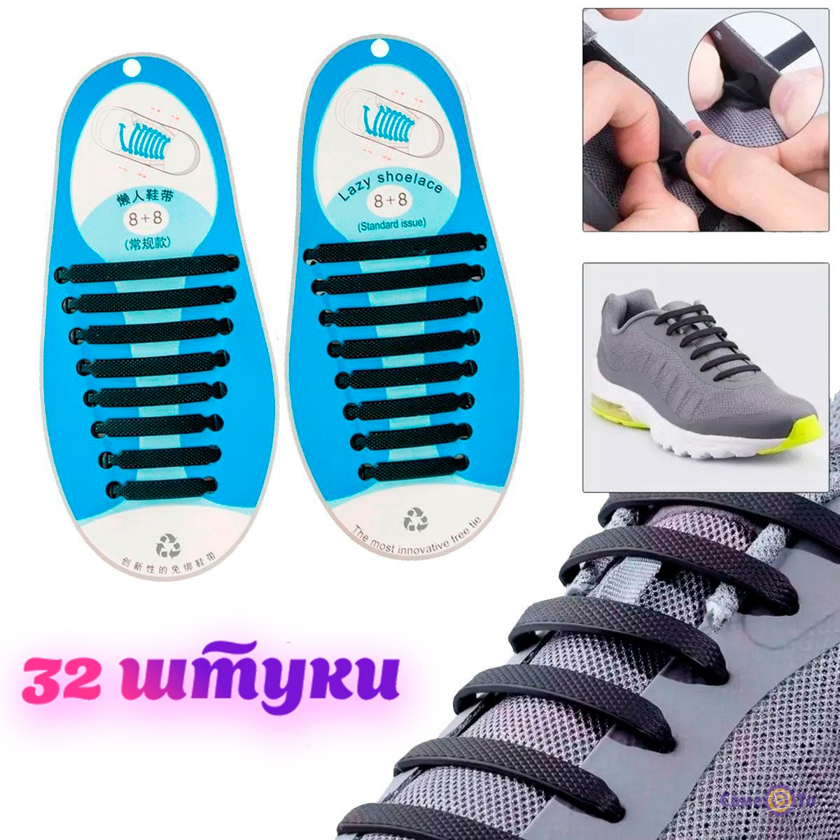 Силіконові шнурки - це ідеальне рішення для всіх, хто цінує комфорт і практичність. Цей комплект включає 32 чорні антишнурки, які перетворять взуття на зручне взуття без необхідності зав'язувати шнурки.