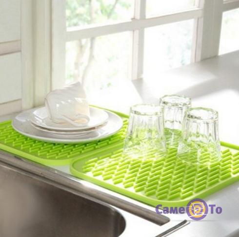 Є більш зручний варіант - килимок для сушки посуду. Він зроблений з непромокаючого матеріалу - харчового силікону. Тому воду, що на нього стекла, можна просто злити в раковину, згорнути килимок і покласти його на зберігання в будь-який ящик до наступного використання. Він компактний і не займе багато місця.