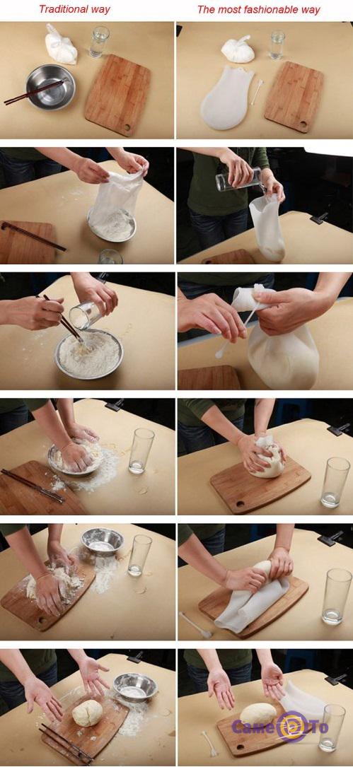 Использовать силиконовый мешок для замеса теста очень просто. Достаточно высыпать в него необходимые ингредиенты, закрыть горлышко специальным силиконовым шнурком и сдавливать и переворачивать мешок так, как Вы делаете это с тестом.