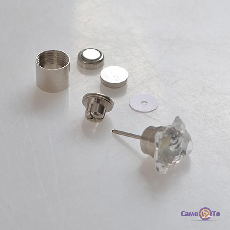 Як джерело світла в сережках використовуються світлодіодні лампочки. Вони дуже економні і використовують мало електрики, тому одного комплекту батарей вистачає на довго. Батарейки вставляються в закріплювачі сережок і легко змінюються після того як їх ресурс вичерпається.