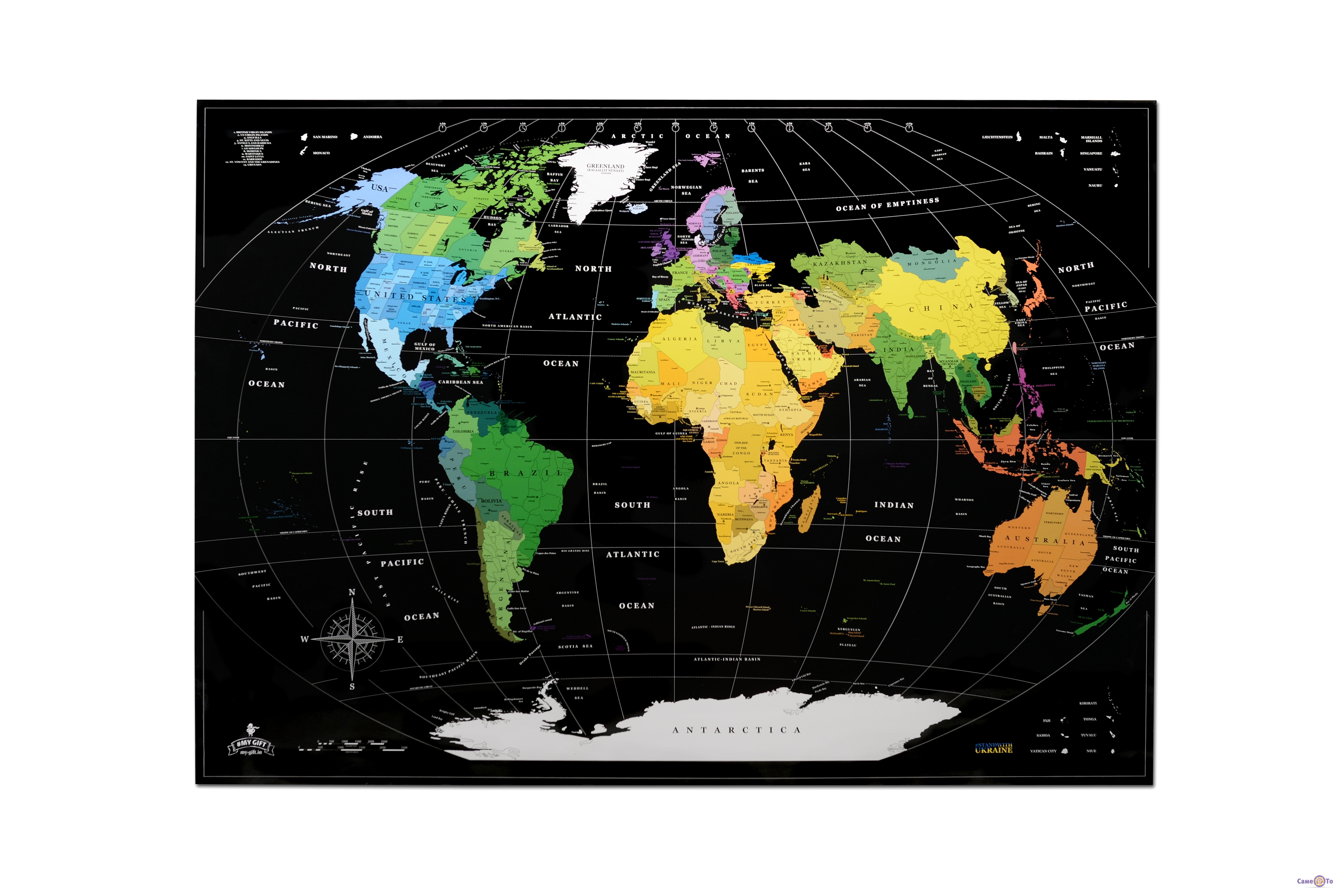 Карта світу "My Map Perfect World", що стирається, виконана в чорному кольорі, що надає їй елегантного і сучасного вигляду. Вона також має великий розмір, що дозволяє легко читати всі написи та деталі.
