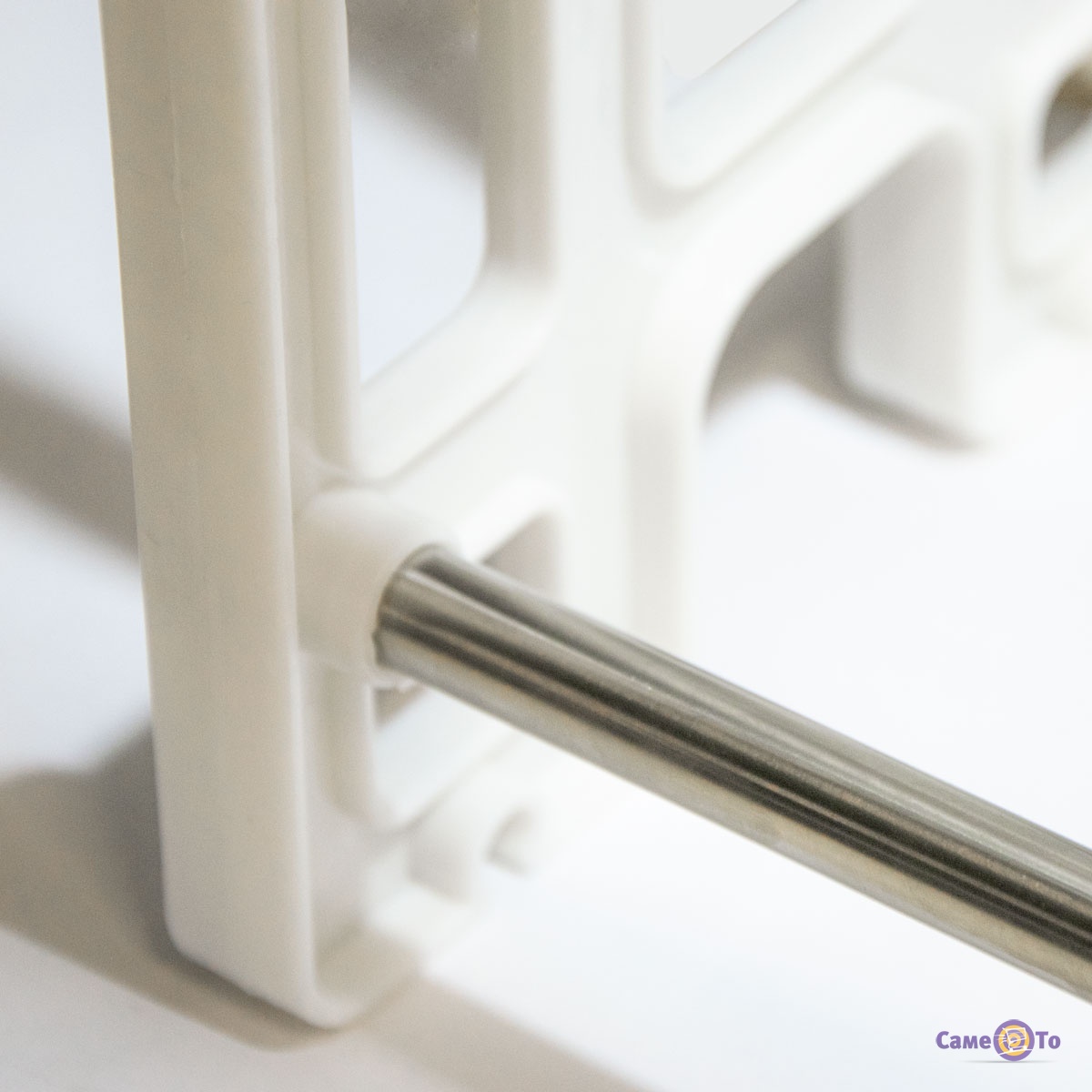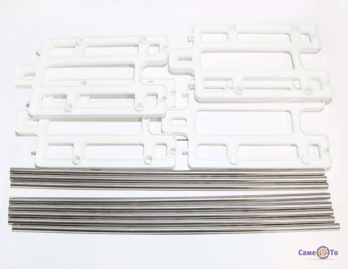 При своїх досить невеликих розмірах в зібраному стані (58х60х18 см), поличка вважається досить місткою і практичною. Компактна взуттєва поличка призначена також для зберігання парасольок, сумок та інших аксесуарів. Підставка виконана в білому кольорі, ідеально підійде під світлий інтер'єр. Основна частина виготовлена з металу, а бічні ж частини полки з пластику. Це говорить про її надійність та спроможність витримати велику кількість пар взуття. Такий стелаж сміливо витримає близько 10 пар взуття. Поличка для взуття має 4 яруси. Поставляється полиця в розібраному вигляді з 8 трубочок і 4 бічних панелей для пластику, все це упаковано в красиву картонну упаковку. Поличка легко збирається з цих деталей в надійну конструкцію. При необхідності в ній є можливість ставити зверху додаткові стелажі. У зібраному вигляді такий стелаж дуже компактний, займає мало місця в передпокої і важить всього 800 грам. Його легко можна перевозити на дачу або в нову квартиру, а в багажнику або на підлозі біля сидіння він не буде займати багато місця. Завдяки матеріалу підставки, її можна легко мити: достатньо протерти губкою або опустити в воду. Після частого миття матеріал не псується і не іржавіє. На 4 ярусах можна спокійно розкласти взуття всієї родини, і ще залишиться місце для нової пари. А якщо зранку потрібно буде швидко зібратися, то все буде на виду і вибрати щось конкретне не складе абсолютно ніяких труднощів. А після приходу можна покласти взуття на місце, і не розносити при цьому бруд по всій квартирі. Також, якщо у вас велика сім'я, можна купити кілька стелажів відразу в нашому інтернет-магазині за доступною ціною.