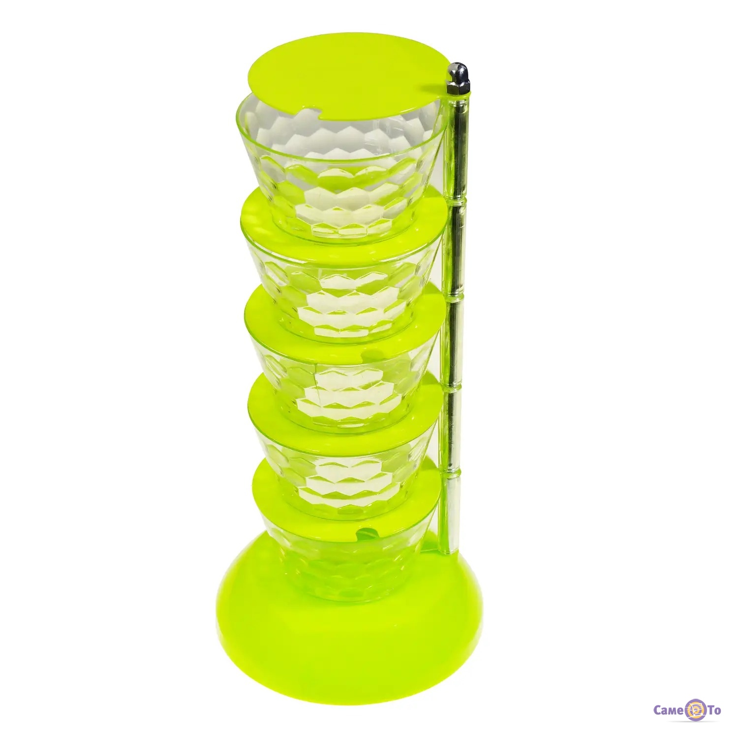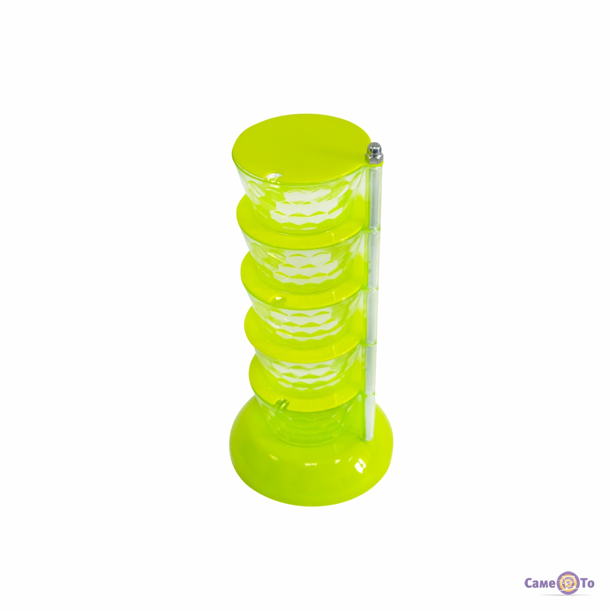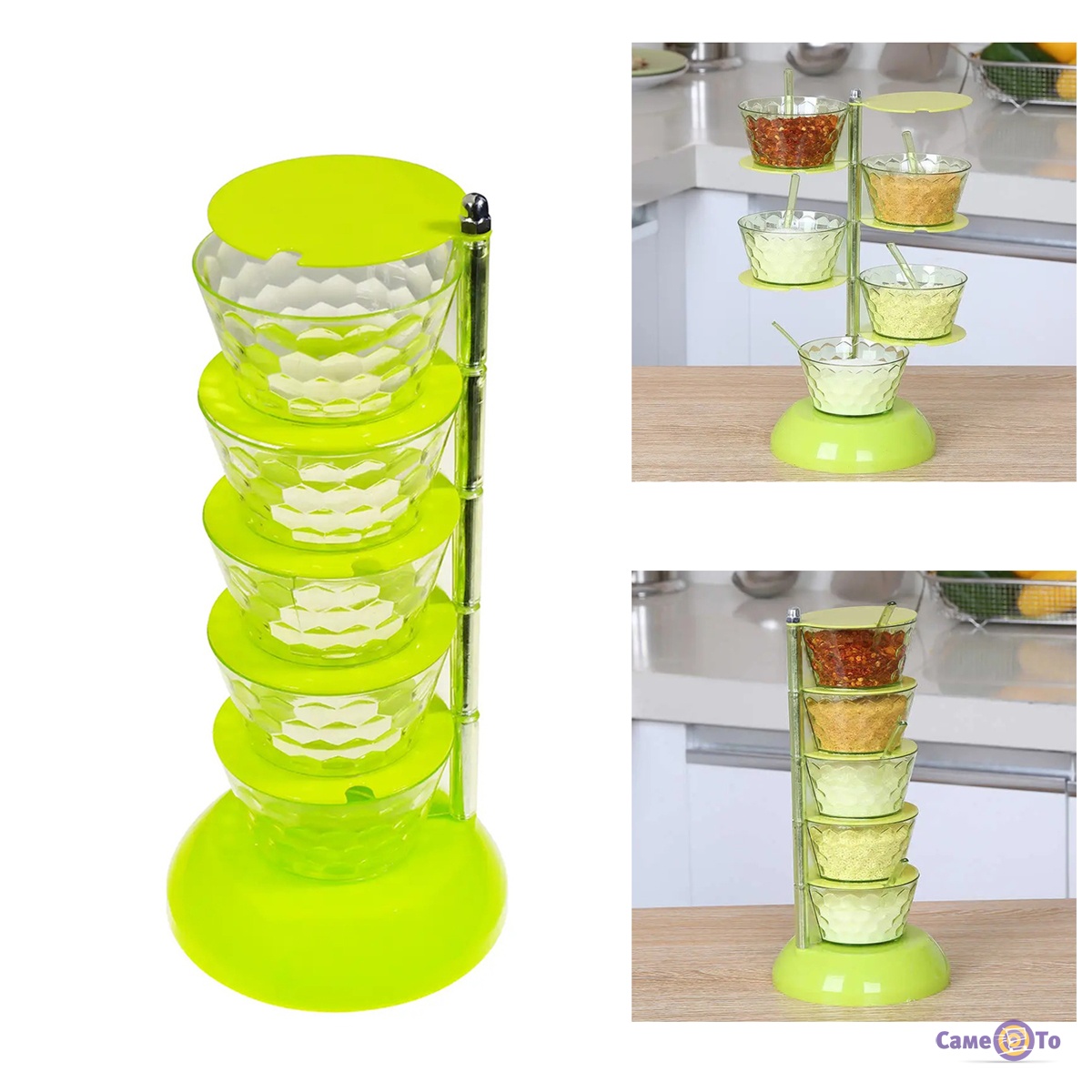 Приведіть свою кухню до ладу за допомогою стильної та практичної стійки з баночками для спецій Seasoning Box у яскравому салатовому кольорі. Цей набір із 5-ти ємностей з ложками пропонує вам зручний та елегантний спосіб зберігання та організації ваших улюблених спецій.