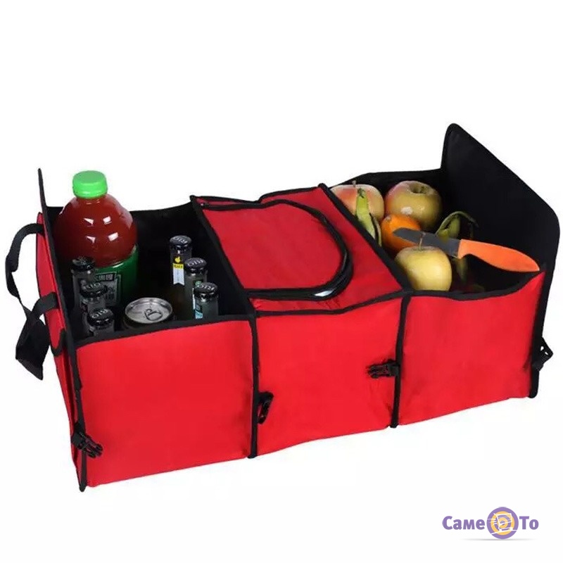 Даний аксесуар в багажник автомобіля складається з трьох основних секцій: середня з них виконує роль холодильника, дві бічні - реалізують функції органайзера. Додатково бічні відділення сумки оснащені ще двома кишенями для дрібних речей розміром 29х22 кожен. У зібраному стані розміри конструкції максимально компактні - 31х28х4, в розібраному вигляді - 60х28х31, при загальній вазі трансформера 850 г.