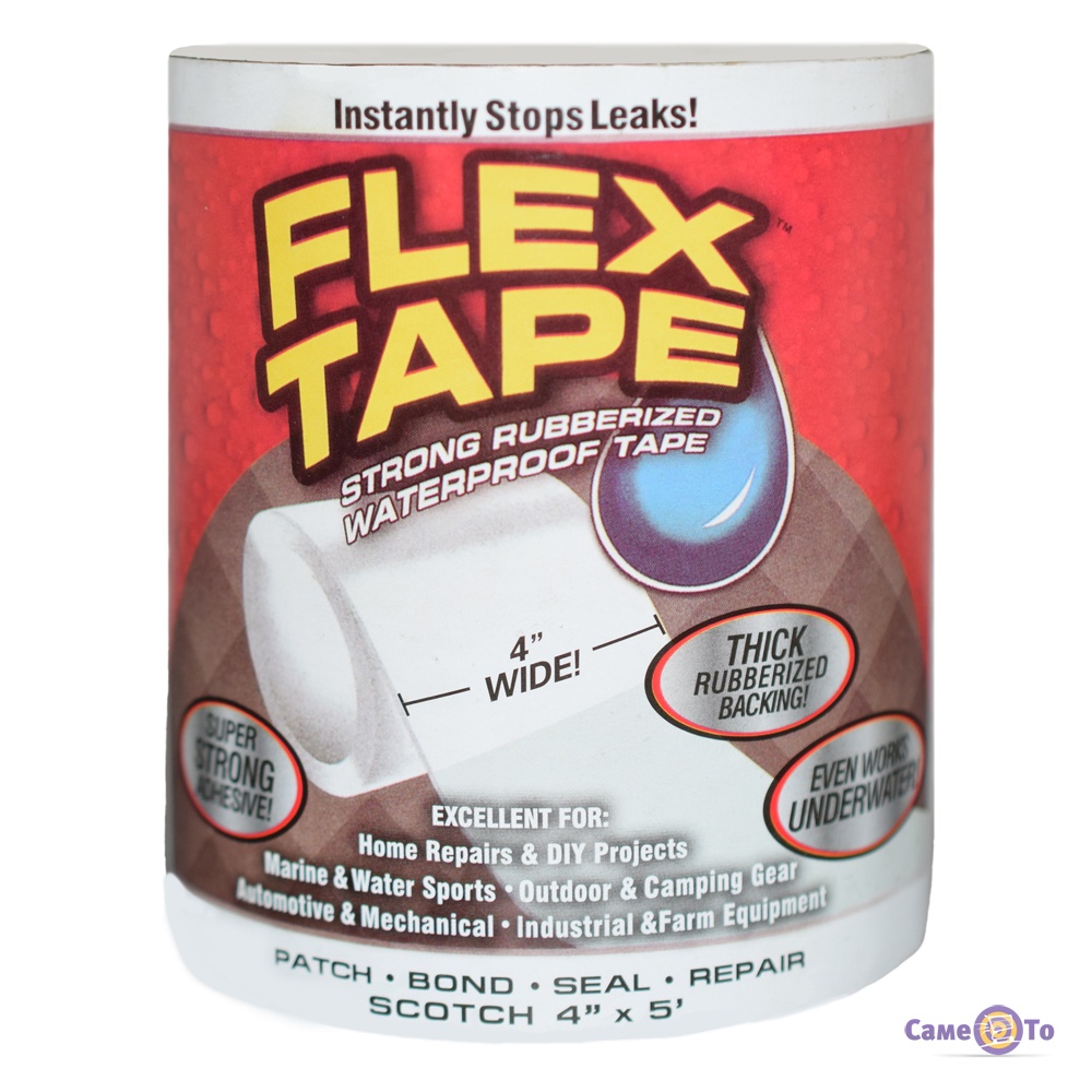 Водонепроникний скотч - це міцна прогумована стрічка, яка не пропускає вологу. Водонепроникна стрічка швидко і просто приклеюється до будь-якої поверхні. Якщо вам потрібно убезпечити будь-які предмети або стики на меблях від води, вам, безсумнівно, в цьому допоможе сверхсильная клейка стрічка flex tape. Вона може навіть склеювати предмети під водою. Може використовуватися в сантехнічних роботах, де можливі різні витоки, також заклеює порвані човна або надувні матраци. Водонепроникна стрічка склеює навіть під водою сумісна з: ПВХ, акрилом, металом, сталлю, міддю, алюмінієм, керамікою, склом, гумою, скловолокном, сухий стіною, цементом і багатьом іншим. Водонепроникна ізоляційна стрічка flex tape ремонтує поливальні шланги, баки, відра, підходить для ремонту дитячих іграшок.