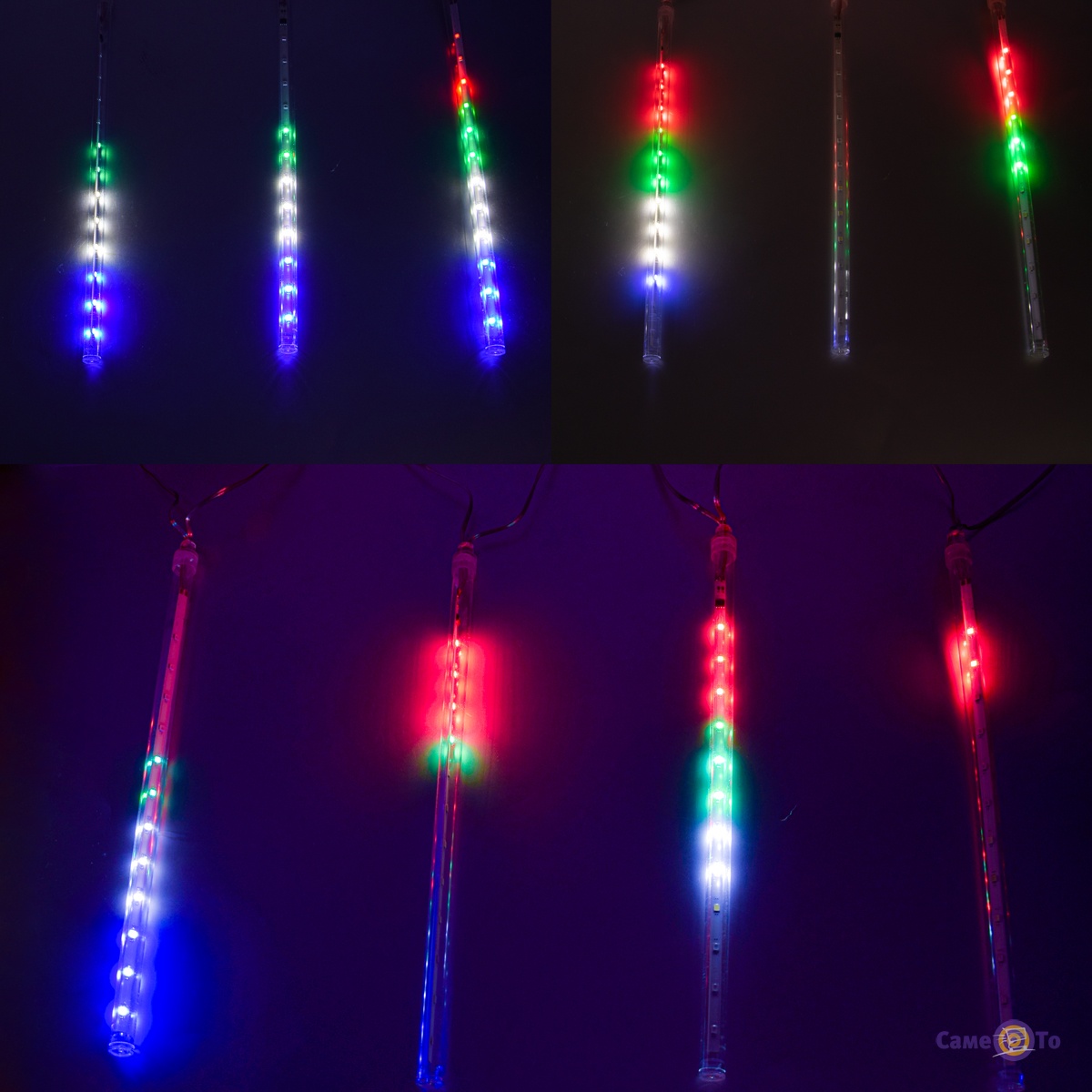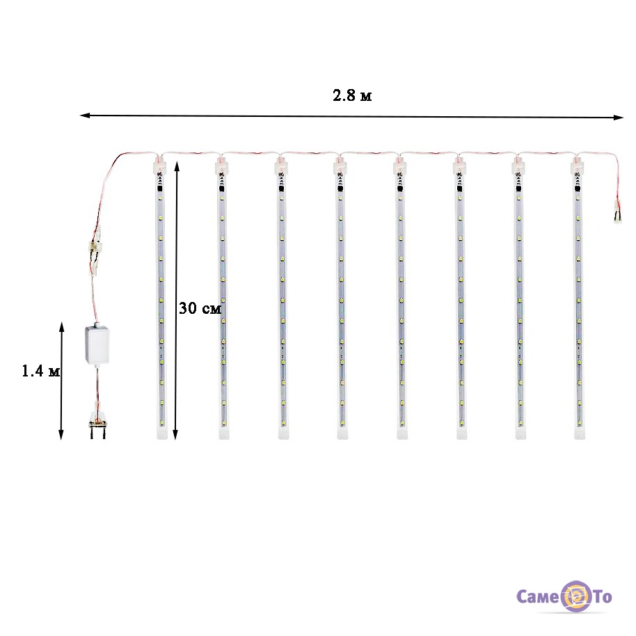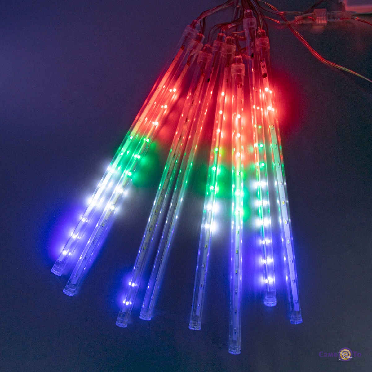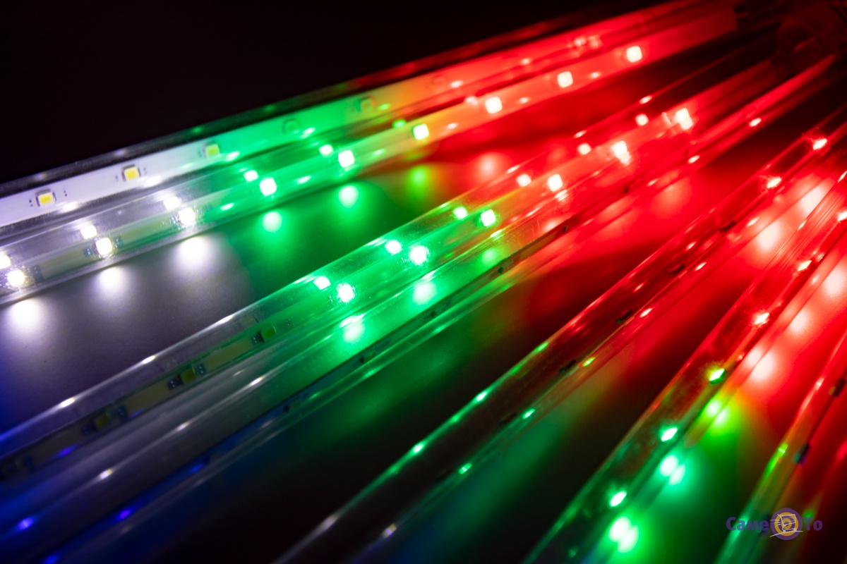 Новорічна гірлянда є ниткою, на якій є пластикові трубочки зі світлодіодами. Колір вогників різний. Почергово запалюючись і згасаючи вони створюють неймовірний світловий ефект, який подібний до вогняного метеоритного дощу, що падає.