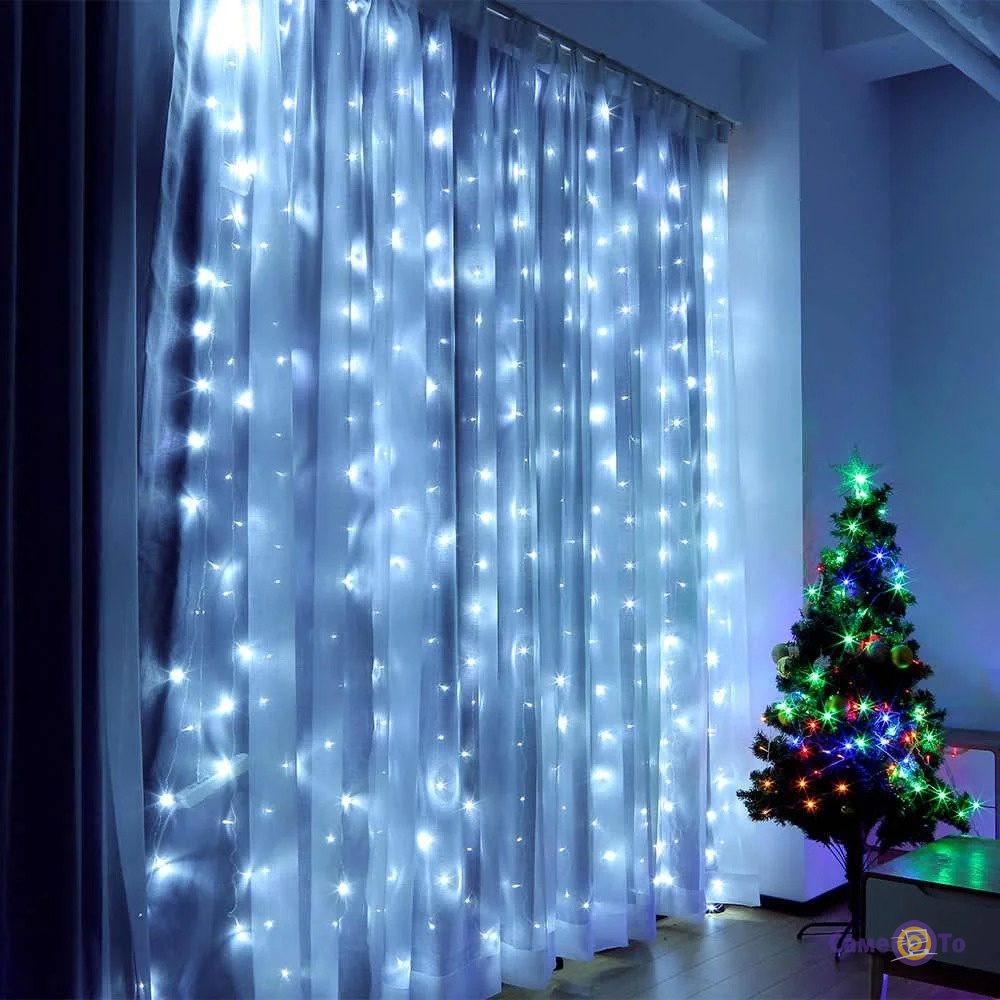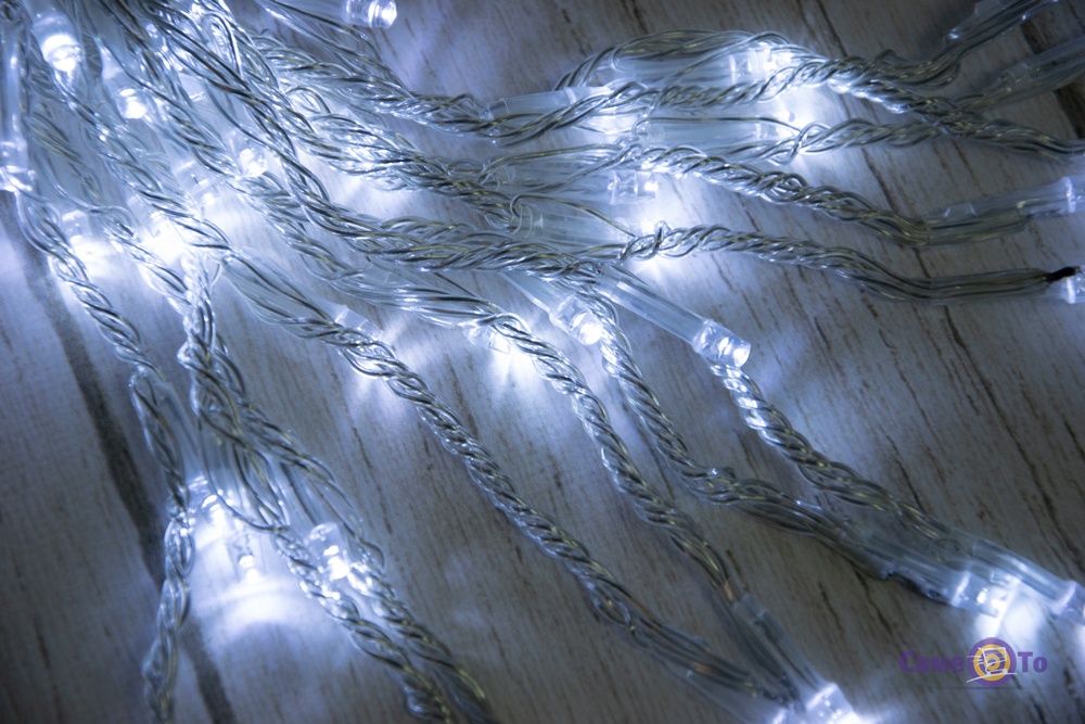 Cветодиодная гирлянда-штора сделана из 3-метрового шлейфа-основания с нитями, которые свисают по всей ее плоскости, тем самым показывают «падающей воды». Ширина гирлянды по карнизу - 3 метра + 90 cм чистый шнур, с целью подключения гирлянды в розетку. Большущим плюсом данной гирлянды считается увеличенная длина шнура, которая есть не во всех моделях данного типа гирлянд.