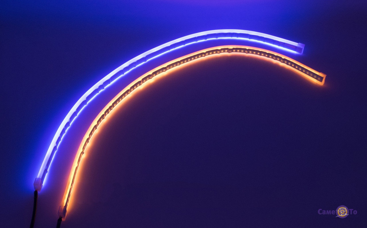 Денні ходові вогні для автомобіля створені для додаткового освітлення під час їзди. Горять постійним білим світлом, при включенні поворотника загоряється жовте світло у вигляді рядка, що біжить. Світлодіодна стрічка здатна додатково яскраво висвітлювати свій автомобіль, допомагаючи тим самим іншим учасникам дорожнього руху краще зорієнтуватися. Кольорова світлодіодна стрічка здатна працювати дуже довго, термін експлуатації досягає 30000 годин. Світло розподіляється рівномірно, без перепадів. Не споживає багато струму, здатна працювати навіть при низьких температурах повітря. Також така світлодіодна стрічка для авто вважається водонепроникною. У комплекті поставляється 2 стрічки, упаковані в зручну і практичну картонну упаковку.