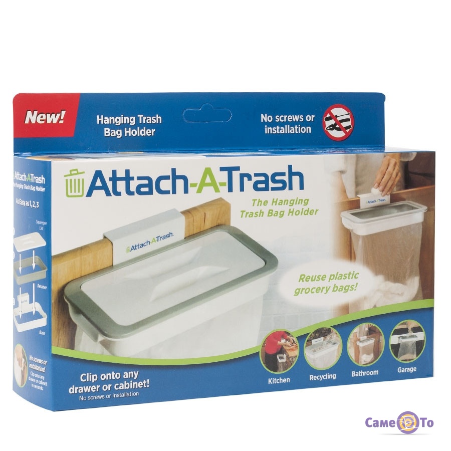 Купити тримач для пакетів – це в першу чергу означає заощадити місце на кухні або у ванній. Attach-A-Trash - це унікальний засіб. Його з легкістю можна прикріпити на дверцята шафи, тумбочки або інших меблів. Для фіксації абсолютно не потрібні саморізи, наклейки, цвяхи та інше. Це означає, що Ви не зіпсуєте поверхню Ваших меблів. Зміна пакету відбувається дуже швидко і просто, всього в кілька рухів.