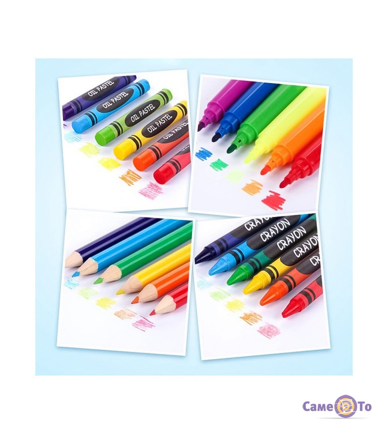 До нього входить 168 різноманітних елементів творчості. У комплекті: маркери, акварель, звичайні кольорові олівці та масляні, масляна пастель, палітра для фарб, гумка, листи формату А4, точилка, гумка, пензлик, клей, простий олівець. Це ціла валіза творчості, яка сприятиме проявити вашому дитині всі свої приховані таланти.