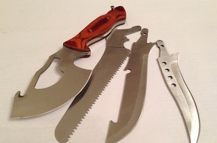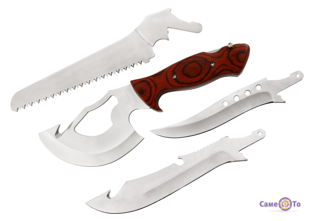 Ніж туриста - універсальний інструмент, що складається з міцної зручній залізної рукояті, обробленої дерев'яними лакованими пластинами, і чотирьох змінних лез різної форми, які змінюються швидко і просто і надійно кріпляться в рукояті.