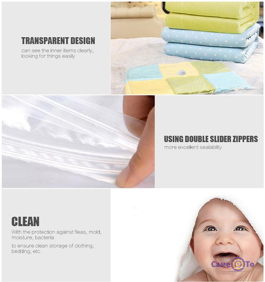 Пакет для речей це оптимальний варіант зберігання улюблених блузочок і кофтинок з користю, вакуумна упаковка забезпечить довговічність Вашому одягу і відповідно дасть більше місця для нових покупок. Дуже зручно зберігати вироби з пуху, наприклад подушки, ковдри, пуховики. При використанні вакуумного пакета для пухових виробів, його слід акуратно запаковувати, так щоб не пошкодити наповнення виробу, не більше ніж на п'ятдесят відсотків. Усі Ваші речі будуть надійно захищені від абсолютно будь-яких комах, від такого набридливого пилу, неприємного запаху затхлості, вогкості і вологості, плям, плісняви і при цьому, звільняючи більше простору, на 75 відсотків зменшуючи їх об'єм. Дуже зручно зберігати постільну білизну, рушники, дитячі м'які іграшки. Небажано використовувати для речей з хутра та шкіри, а також, щоб блискавки, залізні гудзики, кнопки стикалися безпосередньо з пакетом. Інструкція до використання такого пакета: перед упаковкою потрібно переконатися в тому, що всі речі, просушені і випрані, склавши вироби, необхідно перевірити, що залишилося приблизно близько десяти сантиметрів до застібки пакета, не перевантажувати, вага не повинна бути більше п'ятнадцяти кілограм. Закривши пакет, переконайтеся в його герметичності. Видалити повітря можливо за допомогою пилососа, притиснувши шланг до клапана пакета. Речі до зберігання готові! При зберіганні довгий час, бажано провітрювати пакет раз на півроку, проробляючи ту ж процедуру, що і на початку пакування. Вакуумні пакети призначені для багаторазового використання. Щоб не пошкодити пакет його не слід зберігати поряд з предметами, у яких гострі кути, біля вогню, при низькій температурі 0 і вище 50-ти градусів. Не слід упаковувати продукти харчування. Купити вакуумні пакети Ви зможете в нашому інтернет магазині за дуже привабливою ціною.