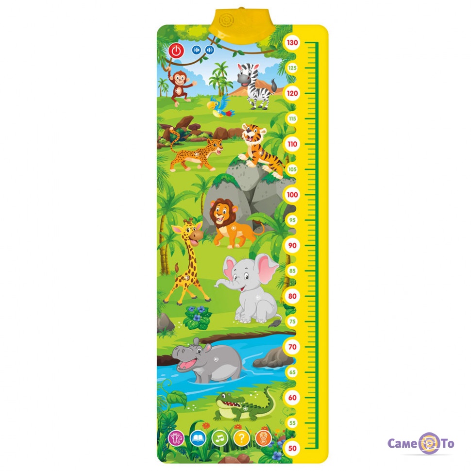 Настінний дитячий ростомір Зоопарк - це інтерактивна модель, яка характерна своєю малогабаритністю, компактністю Вона займає небагато місця, а функціонує за допомогою батарейок. За допомогою інтелектуального пристрою, ваше непосидюче чадо зможе на деякий час сконцентрувати свою увагу на певному виді діяльності, а також вивчити нові пісеньки, вірші, або ж розібратися в нових видах тварин і вивчити їх.
