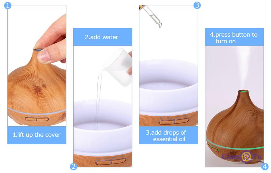 На відміну від звичайних аромаламп, ніяких свічок купувати не потрібно. Рідина, що знаходиться всередині, нагрівається і починає випаровуватися від впливу ультразвуку, випромінюваного вбудованим елементом, що живиться від звичайної електромережі. Просто включіть прилад у розетку, використовуючи адаптер, що входить в комплект.